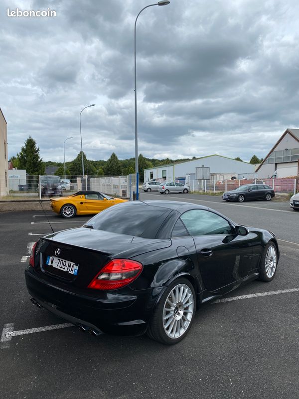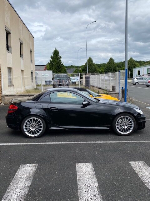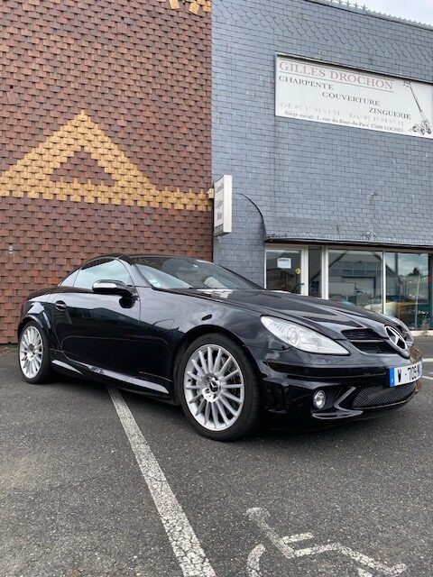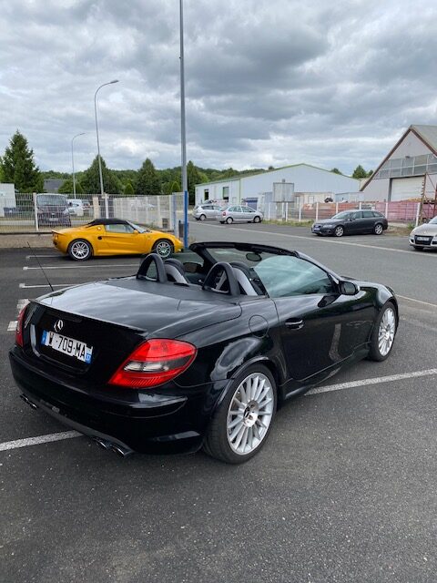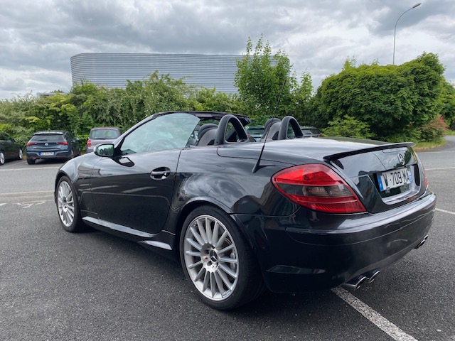 Un SLK 55 AMG, V8 atmosphérique 5.4L, 360 chevaux qui rugissent à ciel ouvert.
